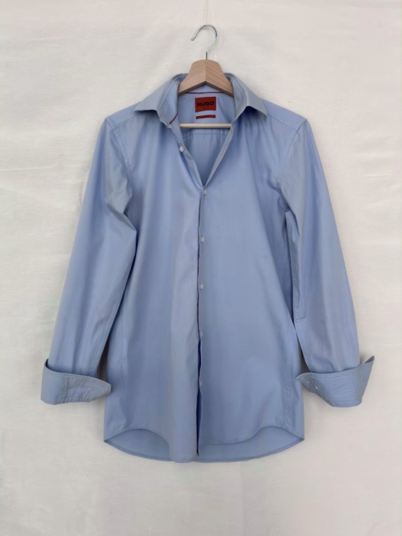 Klasyczna niebieska koszula marki Hugo Boss o kroju slim fit. Zapinana na białe guziki. Ma usztywniane mankiety rękawów i kołnierzyk, a także wyjmowane usztywniacze do kołnierzyka dzięki czemu koszula dobrze się układa i na długo zachowa swój kształt. W środku pod kołnierzykiem czerwona lamówka.